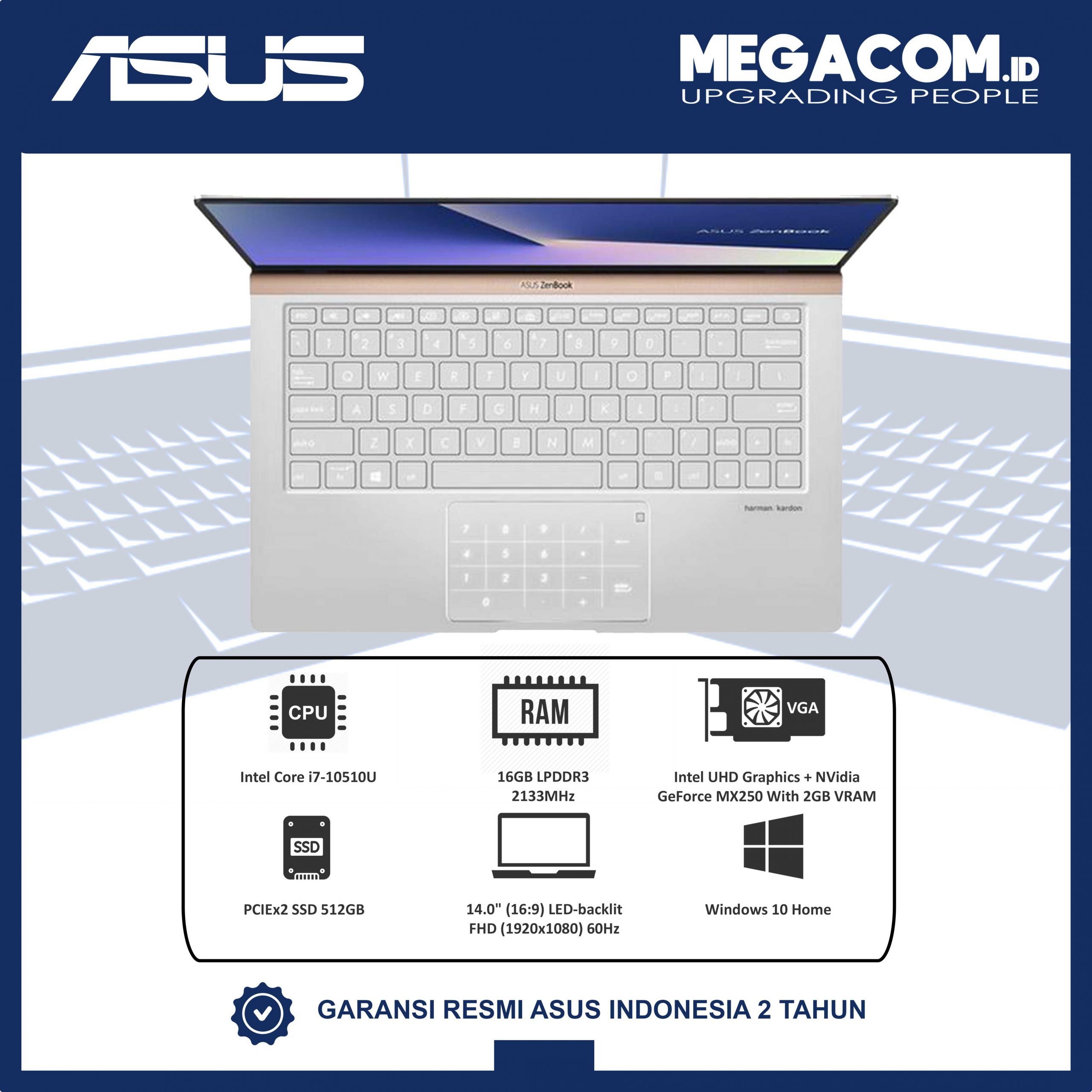 Asus Zenbook UX433FLC-A702T Laptop Kreativitas, Gaya, Inovasi Ini adalah kualitas yang menentukan ZenBook 13 baru yang elegan. Segala sesuatu dalam mahakarya ini – it’s the world’s smallest 13-inch laptops* – dirancang dengan layar NanoEdge yang seperti tanpa bingkai yang menakjubkan dan keypad Numeric yang memberi Anda kebebasan untuk menemukan daya kreativitas Anda.